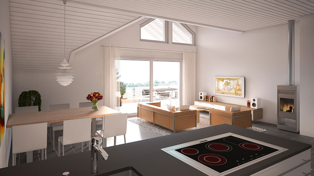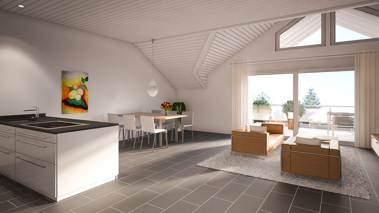 Die 4,5-Zimmer-Wohnungen im Haus D und E und die 5,5-Zimmer-Wohnungen im Haus F zeichnen sich durch einen sehr gut durchdachten und grosszügigen Grundriss sowie einer guten Ausstattung aus. Die Wohnungen im Haus D und E weisen eine Bruttowohnfläche von 141 m2, im Haus F 178 m2 auf. Alle Wohnungen sind mit einem grossen Nordwestbalkon bzw. -Terrasse mit Geräteraum ausgestattet. Jede Wohnung beinhaltet zwei Tiefgaragenstellplätze. Des weiteren sind in jeder Wohnung Kaminanschlüsse für eine gemütliche Feuerstelle vorbereitet. Waschmaschine und Tumbler sind inklusive.